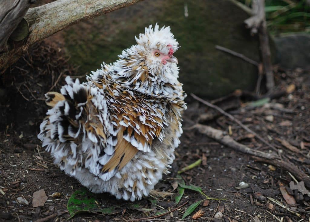 Frizzles have curled fluffy plumage. Although the history of the Frizzle breed is not known, experts believe that they originated in the Far East during the 1800s. This bird can lay eggs, but owners keep them for their entry into awards shows.