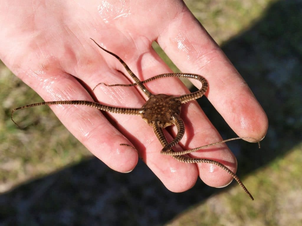 The long arms of brittle starfish are easy to break. The arm will break easily and flop around to attract predators’ attention, while starfish run. The arm will grow back like a lizard tail once it has reached safety. They can grow to about a foot in length and are very active while hunting. The nocturnal brittle starfish will hide in the dark, but they will still move for food during daylight hours.