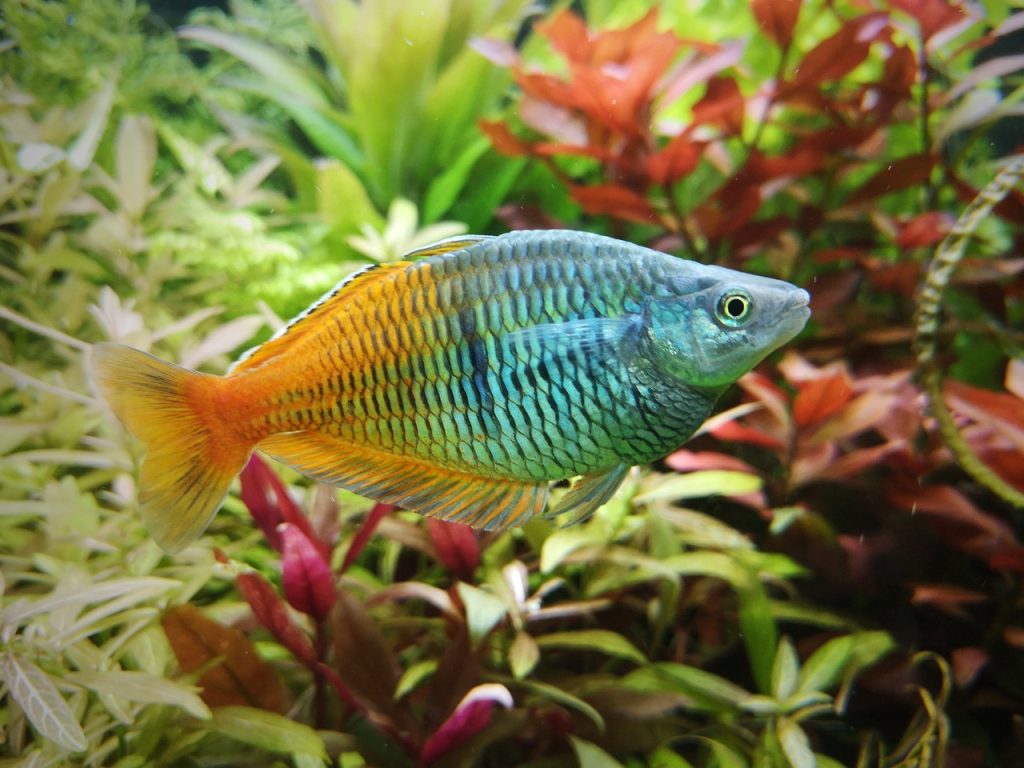 The Lake Kutubu Rainbow Fish is usually a blue-green fish with a white belly. These peaceful fish love to socialize with other fish. They can grow up to 5 inches in length when fully grown. If kept in an aquarium that holds more than 20 gallons, this breed can live for about five years. They prefer a well-planted aquarium, but they will spend most of their time at the top.